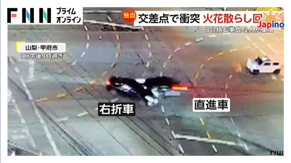 Isang security camera na naka-install sa isang hotel sa lungsod ng Kofu, prefecture ng Yamanashi, ang nakarekord ng eksaktong sandali ng isang malubhang aksidente bandang alas-9 ng gabi noong ika-1 ng buwan. Makikita sa video ang banggaan sa pagitan ng isang sasakyang dumadaan nang diretso at isa pang sasakyang lumiliko pakaliwa sa isang malapad na interseksyon.