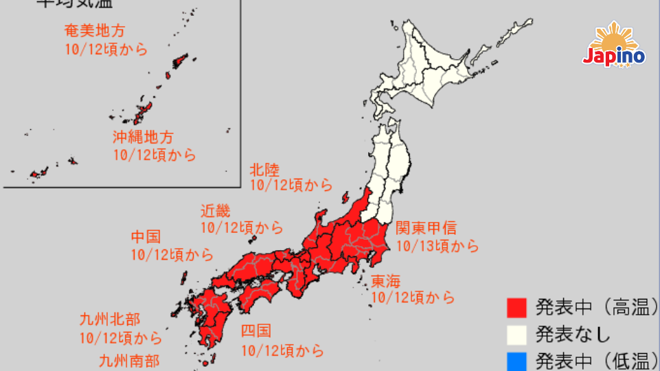 Naglabas ang Japan Meteorological Agency (JMA) noong Lunes (Oktubre 6) ng maagang babala para sa isang hindi pangkaraniwang heat wave na inaasahang tatama sa malaking bahagi ng bansa simula Oktubre 12. Maaaring tumaas ng hanggang 2 °C ang temperatura sa mga rehiyon ng Hokuriku, Tokai, Kinki, Chugoku, Shikoku, hilaga at timog ng Kyushu, Amami, at Okinawa. Sa rehiyon ng Kanto-Koshin, kabilang ang Tokyo, inaasahang lalong iinit simula Oktubre 13.